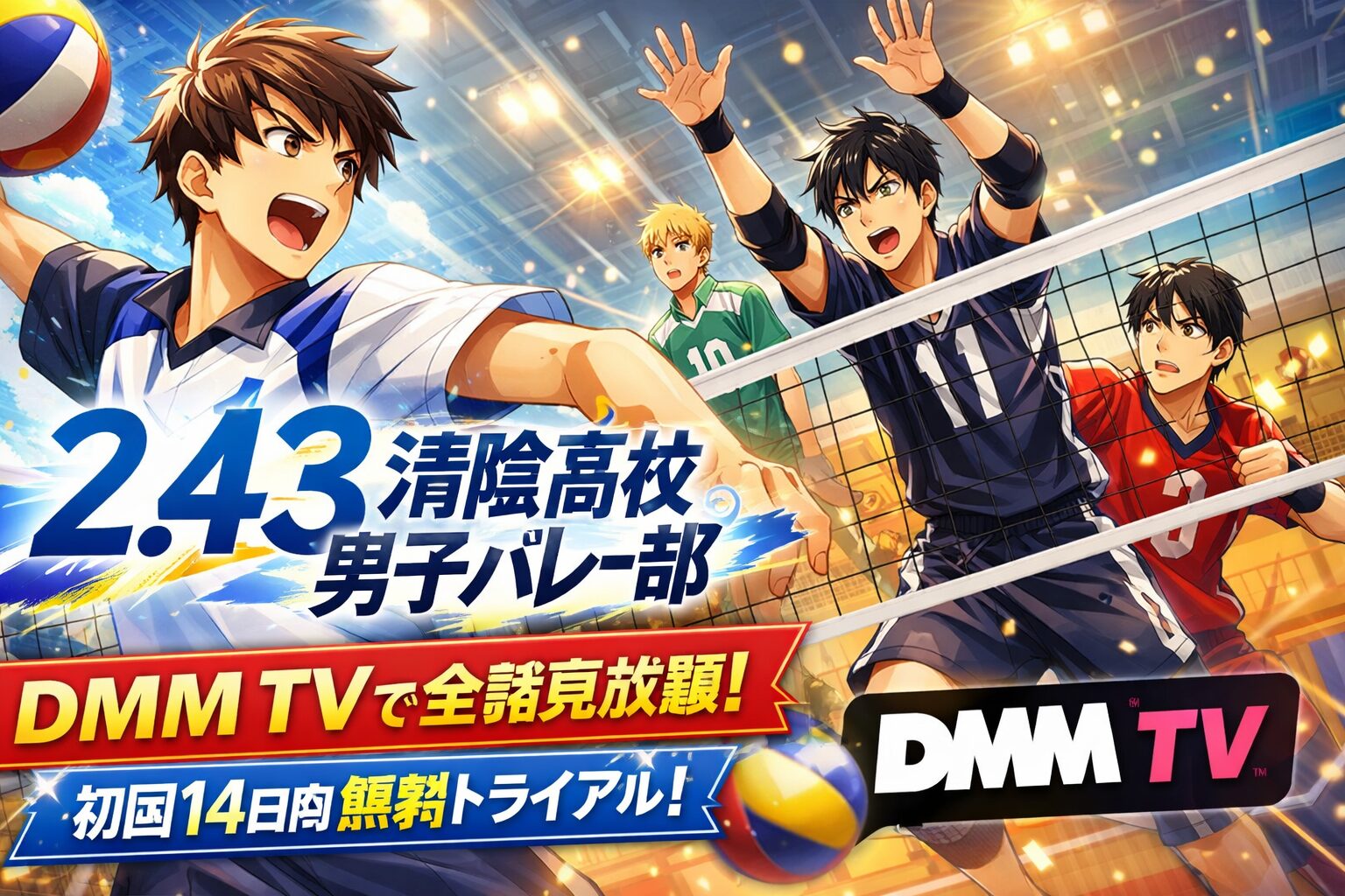 「2.43 清陰高校男子バレー部」のアニメ全12話は、DMM TVのプレミアム会員なら見放題で視聴可能です。月額550円(税込)で190,000本以上の作品が見放題になり、初回14日間の無料お試し期間が用意されているため、無料期間中に全話を視聴して解約すれば料金は一切かかりません。