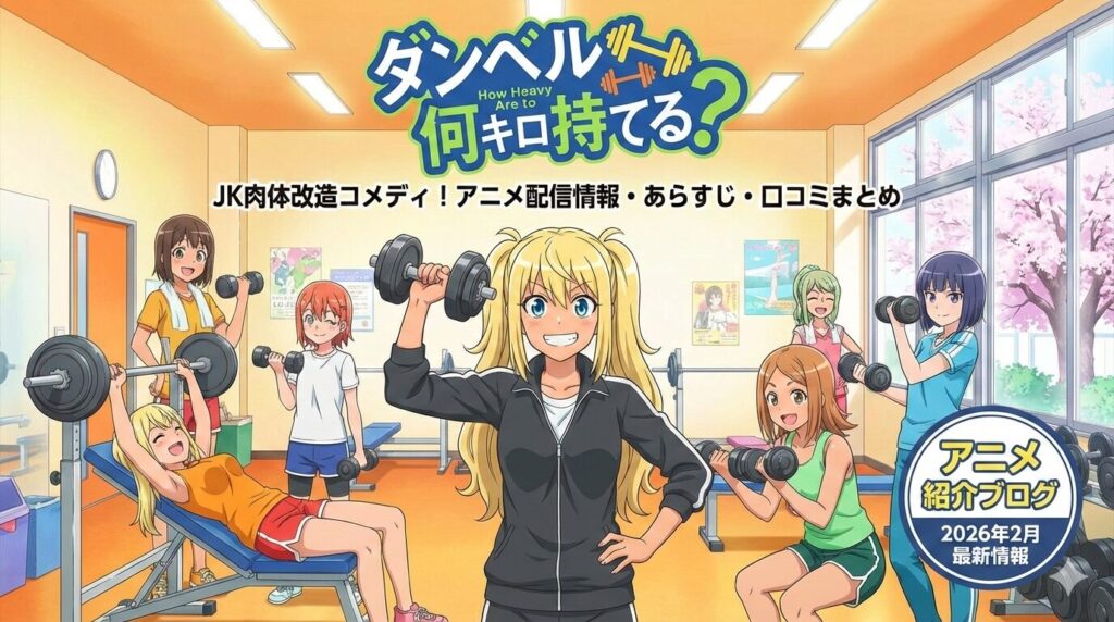 アニメ『ダンベル何キロ持てる?』のDMM TV配信状況(2026年2月最新)、全12話のあらすじ・ネタバレ、見どころ、口コミ評判をまとめました。現在の視聴方法やOP「お願いマッスル」の人気についても詳しく解説しています。
