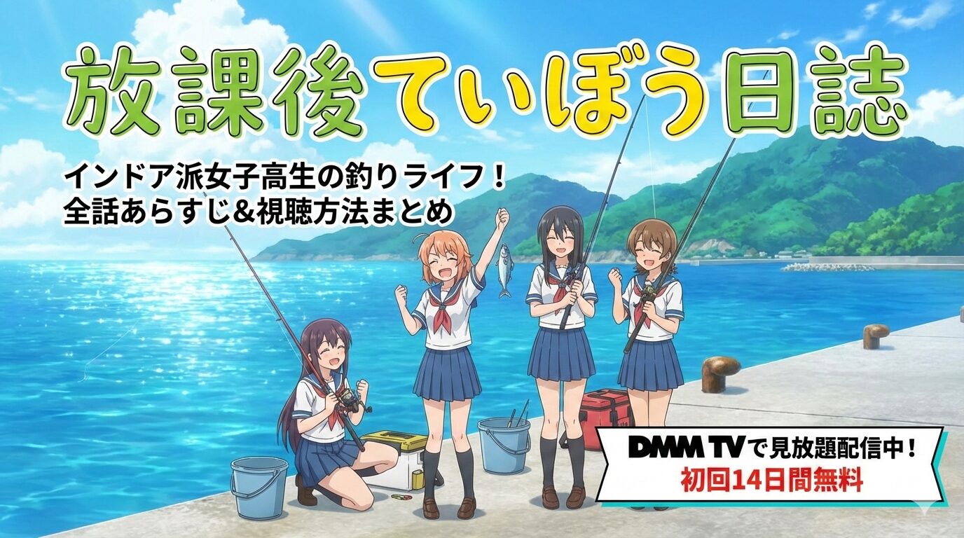 「放課後ていぼう日誌」は、釣り初心者の主人公が仲間との交流を通じて少しずつ成長する全12話の日常系アニメです。動画工房による美しい作画と、熊本県芦北町をモデルにしたのどかな風景描写が高く評価されています。2026年2月現在、DMM TVでは全12話が見放題で配信中です。月額550円(税込)で視聴でき、初回14日間の無料体験期間を利用すれば実質無料で全話を楽しめます。釣り未経験者にもわかりやすい丁寧な解説が魅力で、日常系アニメや癒し系作品が好きな方、釣りに興味がある方に特におすすめの作品です。