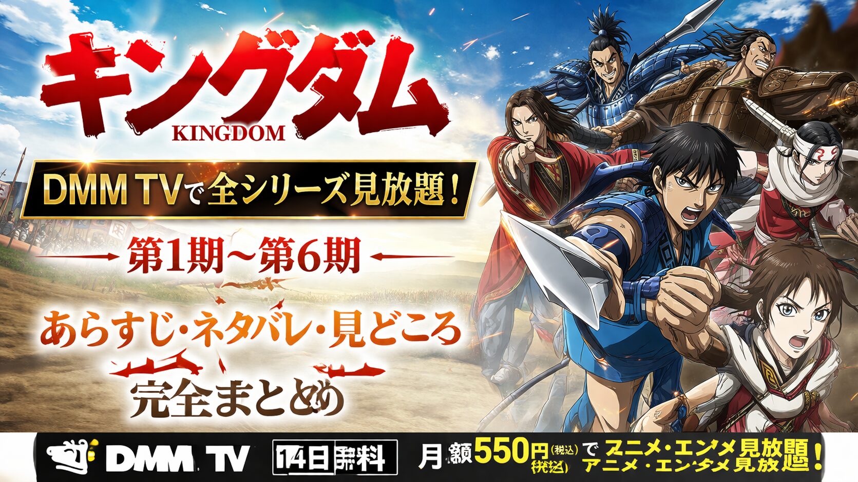 現在(2026年3月時点)、アニメ『キングダム』の第1シリーズ〜第6シリーズは、DMM TVにて全話見放題で配信中です。初回登録から14日間は無料で視聴できるため、シリーズ未視聴の方も安心して全編チェックすることができます。また第6シリーズ続編の制作も正式に発表されており、まだ追いついていない方は今が最高のタイミングです。