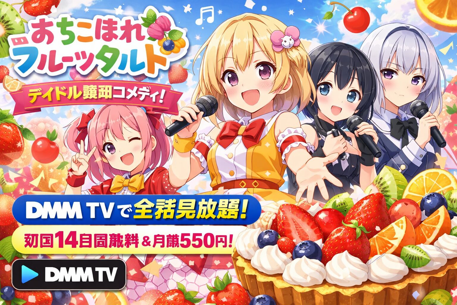「おちこぼれフルーツタルト」は、芸能界の落ちこぼれ少女たちがアイドルユニットを結成して奮闘するコメディアニメです。DMM TVで全話見放題配信中で、月額550円(税込)・初回14日間無料で楽しめます。