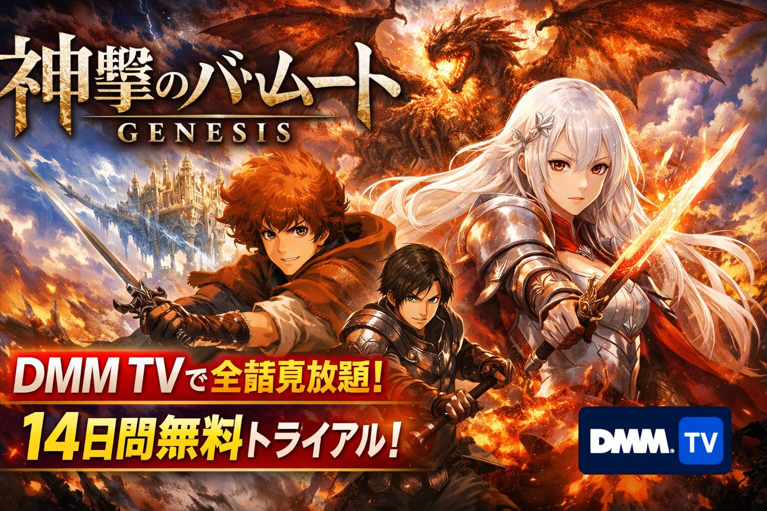 「神撃のバハムート GENESIS」はDMM TVで全13話が見放題配信中です(2026年2月28日確認済)。月額550円(税込)、初回14日間無料のDMMプレミアムに登録すれば、劇場アニメ級の映像美で描かれる本作を実質無料で一気見できます。本記事ではネタバレありの詳細あらすじ・見どころ・口コミを網羅的にまとめました。